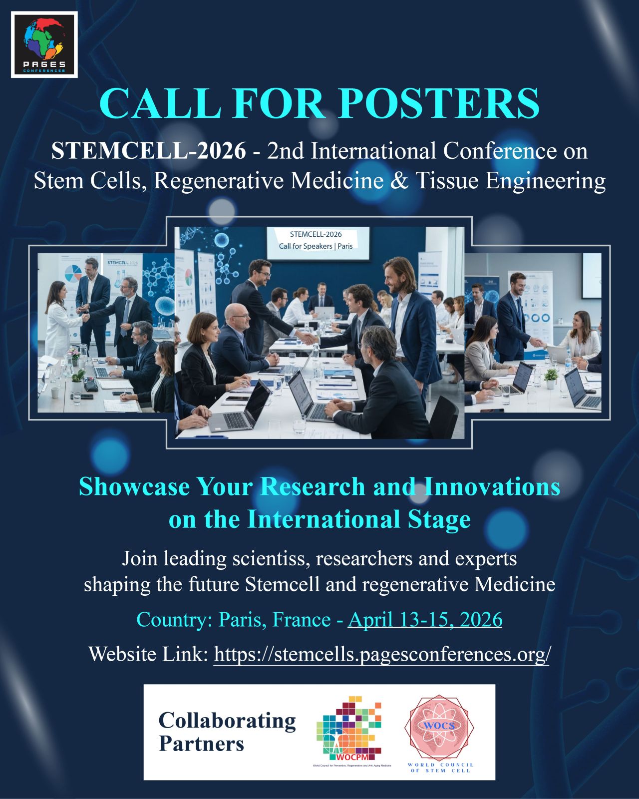 We are pleased to announce that the 2nd International Conference on Stem Cells, Regenerative Medicine & Tissue Engineering will be held on April 13-15, 2026 in Paris, France.