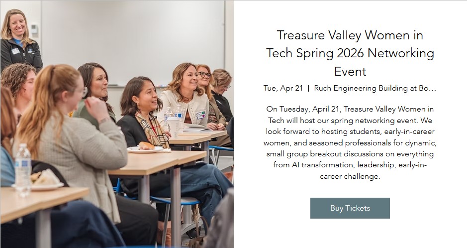 On Tuesday, April 21, Treasure Valley Women in Tech will host our spring networking event. We look forward to hosting students, early-in-career women, and seasoned professionals for dynamic, small group breakout discussions on everything from AI transformation, leadership, early-in-career challenge.