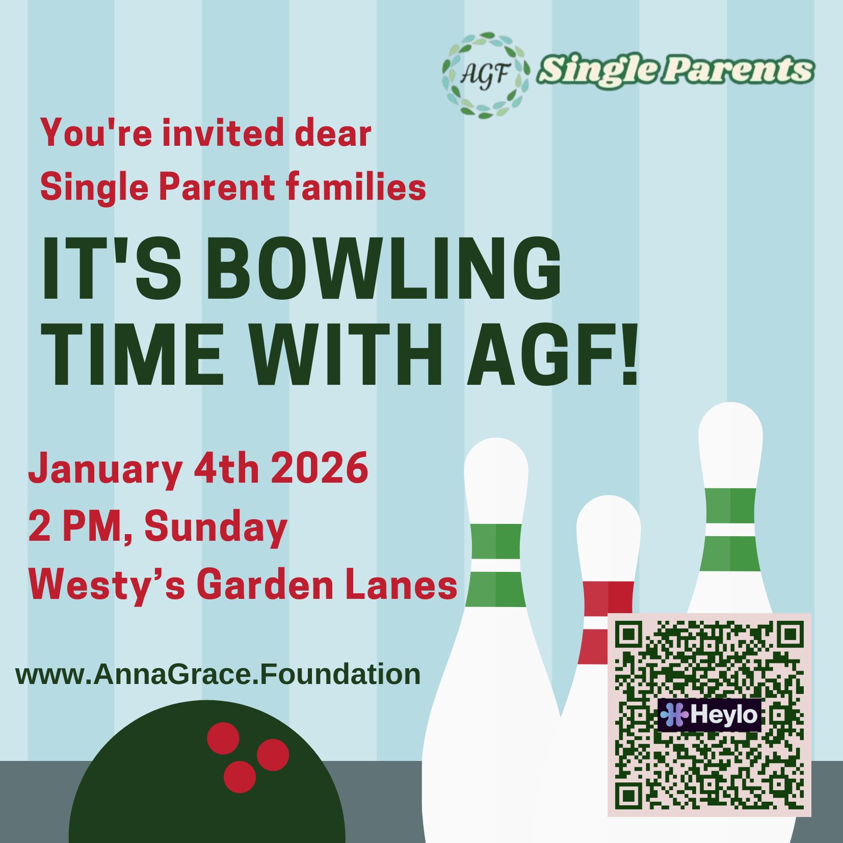 If you miss this bowling event, we will plan another one later in the year. Details to come later. We are planning an Ice Cream Social on March 21, 2026, the National Single Parent's Day! Stay tuned to https://www.heylo.com/agfsingleparents for upcoming events and our website at www.AnnaGrace.Foundation. Thanks!