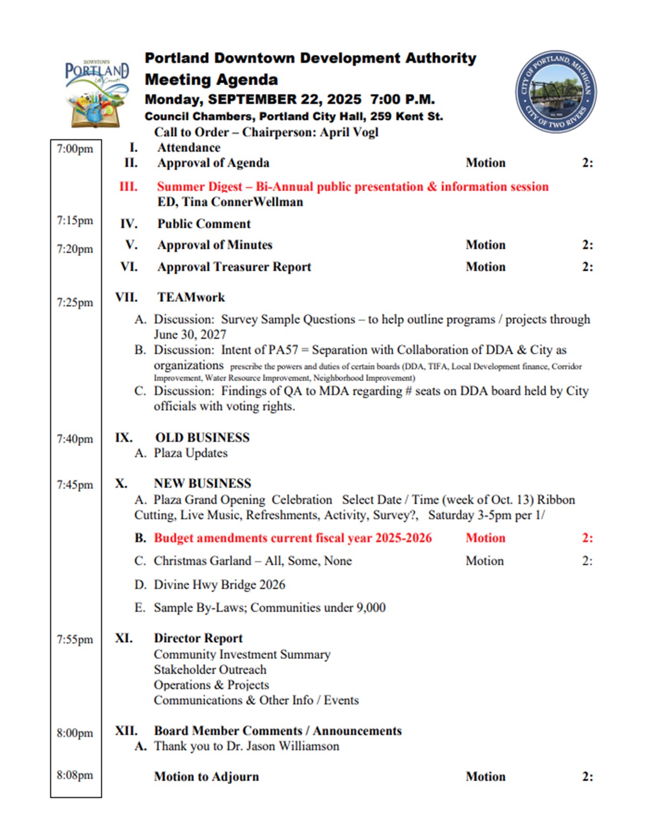 9/22/2025 | The members of Portland Downtown Development Authority Board are people that have a passion for downtown. They have grown up here, created memories here, and love it here. Their dedication stems from their interest in the growth and prosperity of #MiPortland and the community. Our Board aims to ensure that Portland continues to be a place that matters for generations to come. more info... |