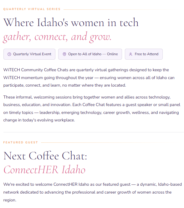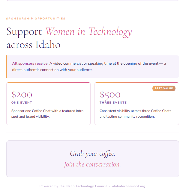 | 6/17/2026 | Tech Ambassador Committee Meeting InvitationIdaho’s Tech Connectors – Welcoming, Engaging, LeadingJoin us for the next Tech Ambassador Committee Meeting—a dynamic gathering of members who are shaping the face of Idaho’s tech ecosystem through hospitality, connection, and leadership. This meeting is a great opportunity to: