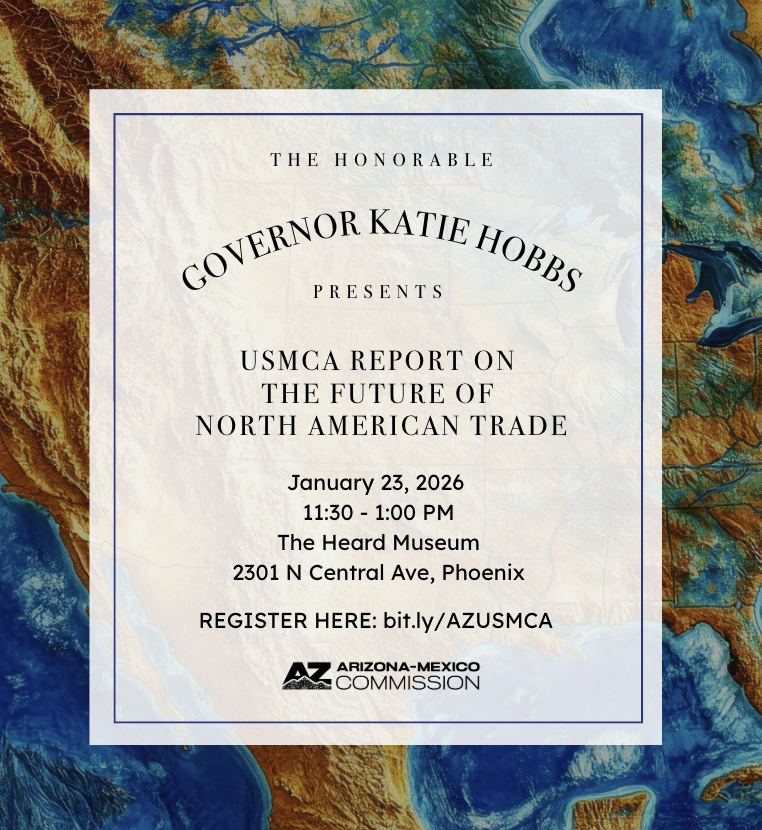 Please join us for an exclusive presentation with Governor Katie Hobbs revealing the findings from Arizona’s USMCA economic study. Discover how the next phase of North American trade could shape Arizona’s economic future.