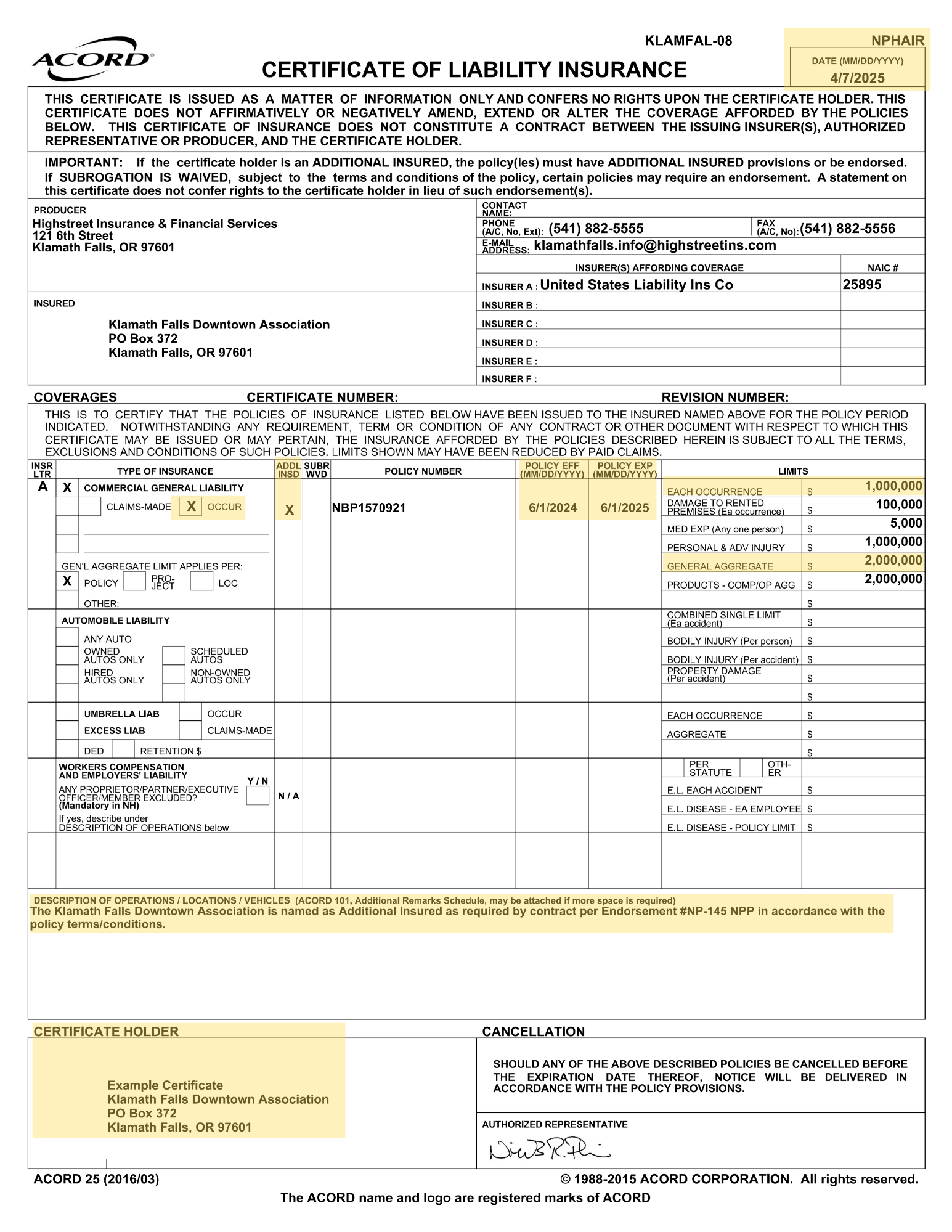 The COI must list the Klamath Falls Downtown Association as both the certificate holder and additional insured and must include the form number for the Additional Insured Endorsement. Vendors should contact their insurance provider with any questions regarding these requirements. An example of a correctly completed COI is provided below.